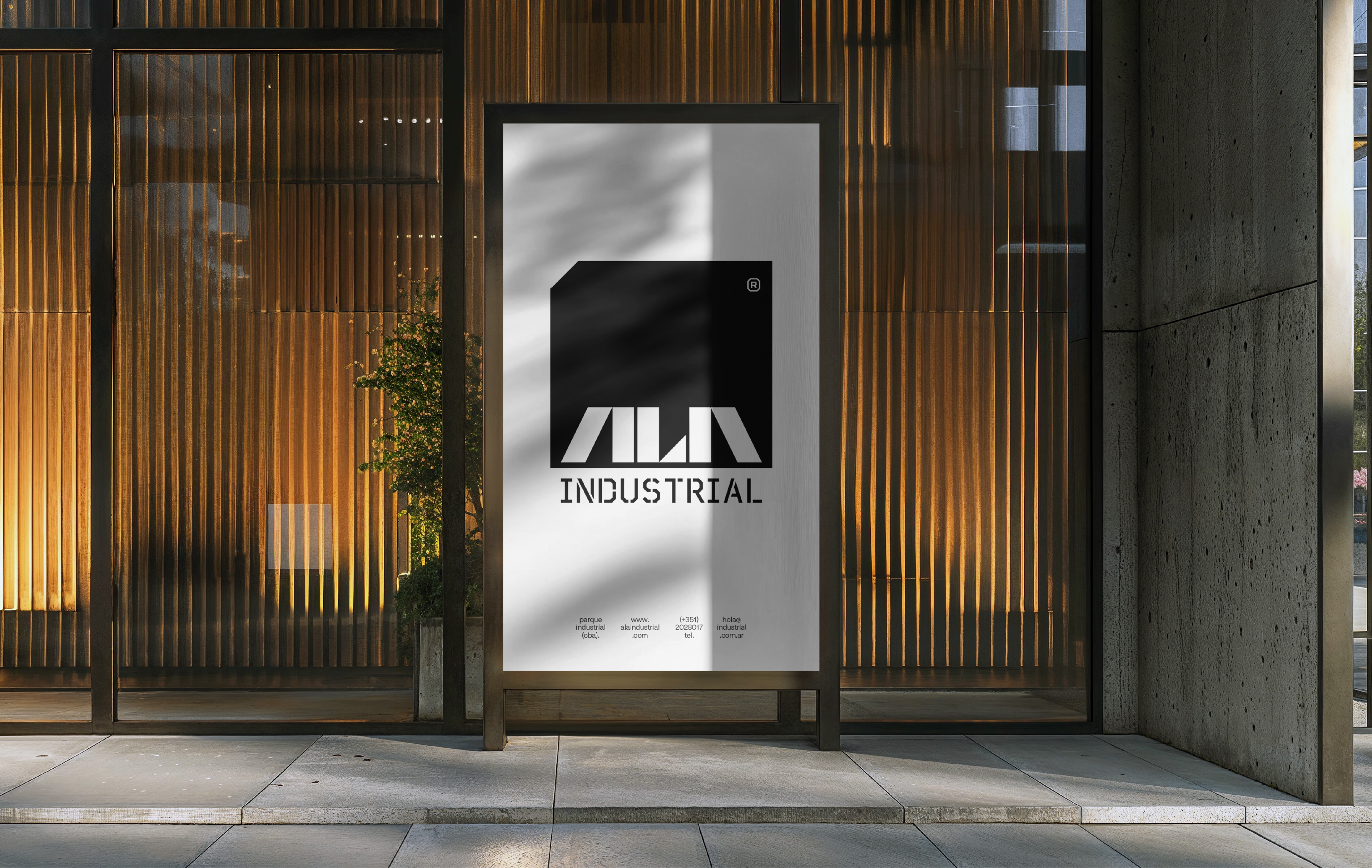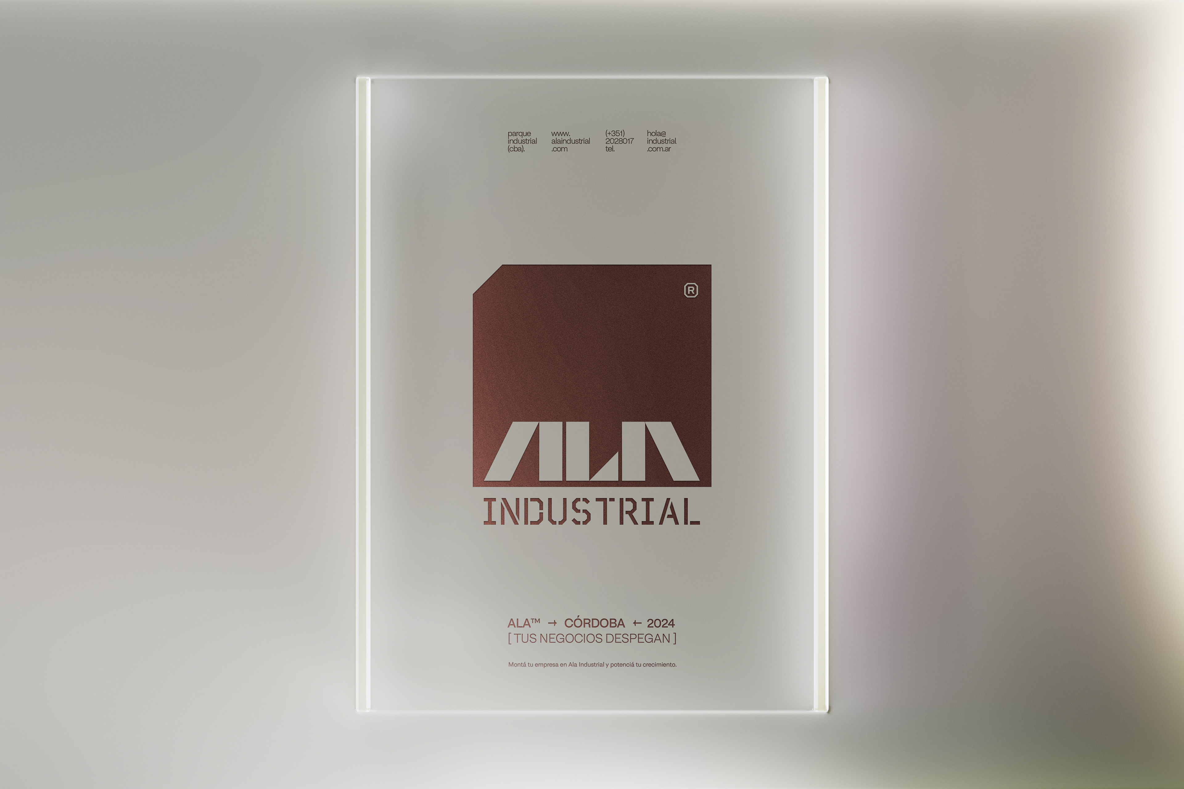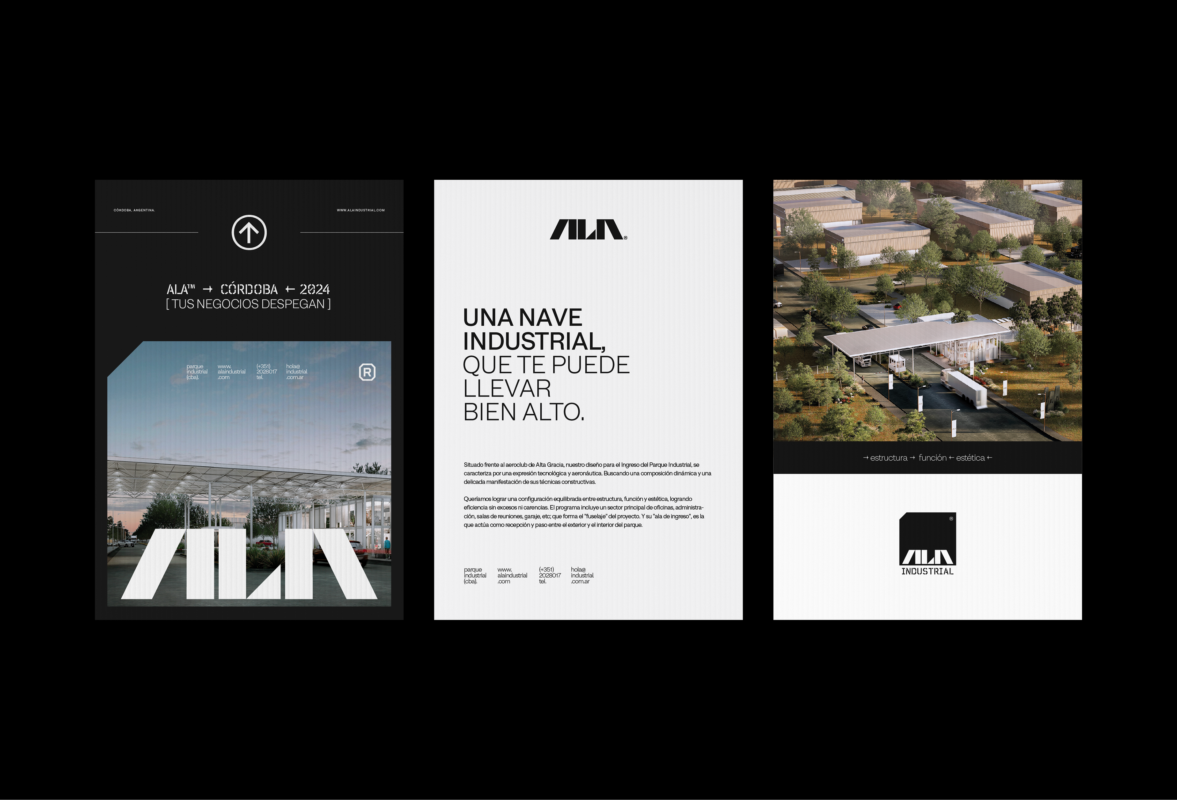 ALA INDUSTRIAL — Brand Identity ALA Industrial is an industrial park located in Alta Gracia, Córdoba. The identity draws inspiration from aviation, using the concept of the “wing” as a symbol of movement, precision, and progress. The visual system is built through clean, structural geometry inspired by aircraft engineering and industrial architecture, communicating innovation, efficiency, and development.