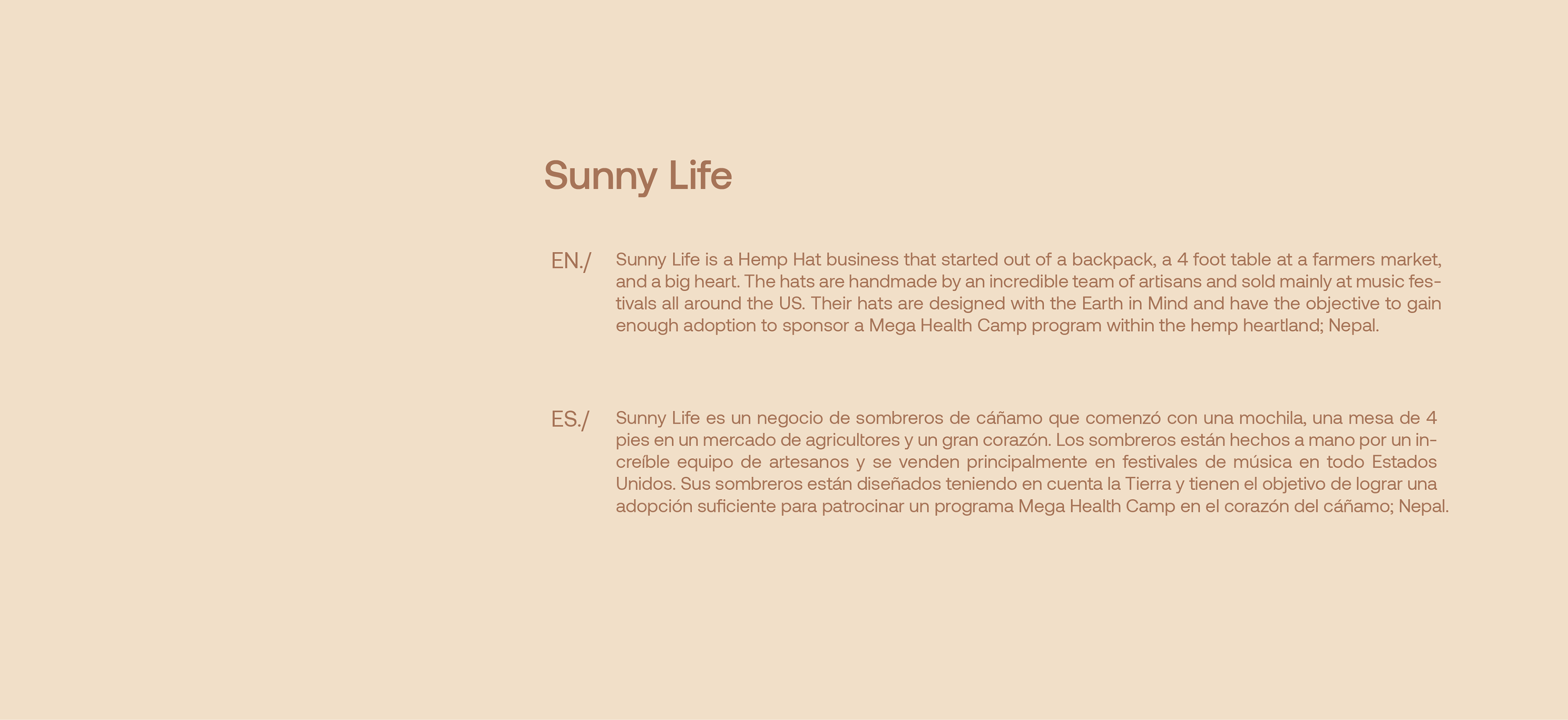 Sunny Life is a Hemp Hat business that started out of a backpack, a 4 foot table at a farmers market, and a big heart. The hats are handmade by an incredible team of artisans and sold mainly at music festivals all around the US. Their hats are designed with the Earth in Mind and have the objective to gain enough adoption to sponsor a Mega Health Camp program within the hemp heartland; Nepal.